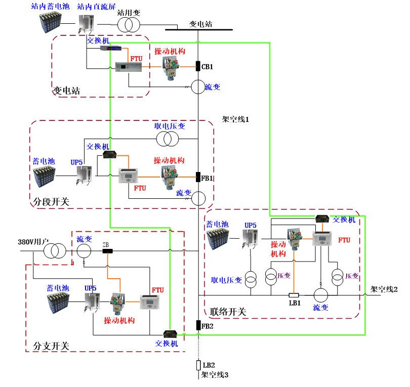 主干線分段開關(guān)設(shè)備配置:FTU、以太網(wǎng)交換機(jī)、斷路器及操動(dòng)機(jī)構(gòu)、流變、取電壓變、蓄電池組、電源管理模塊;