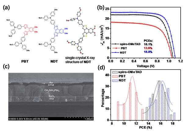 崔彬彬及其合作者設(shè)計(jì)合成了分別以“鄰二噻吩苯”和“萘并雙噻吩”為核心π-bridge的兩種低成本三芳胺類衍生物PBT和NDT(圖1a),并將在這兩種Donor-π-Donor構(gòu)型的有機(jī)小分子作為空穴傳輸層材料應(yīng)用于鈣鈦礦太陽(yáng)能電池器件(圖1c)中。以基于spiro-OMeTAD分子的PSCs器件(最優(yōu)PCE:18.1%,Reverse)為參照,在同樣條件下,基于PBT的PSCs器件達(dá)到的最大光電轉(zhuǎn)換效率為13.6%,而以相對(duì)于PBT具有更好平面共軛特征的NDT作為空穴傳輸層的PSCs器件最優(yōu)光電轉(zhuǎn)換效率可達(dá)到18.8%(圖1b)。
