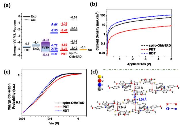 圖2(a)三種有機(jī)分子的能級(jí)分布和與PVSK的匹配程度;(b)“SCLC”法測(cè)試有機(jī)分子的空穴遷移率;(c)三種有機(jī)分子的電荷收集概率PC;(d)NDT分子晶體結(jié)構(gòu)中的π-π堆積和O-π堆積。