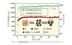 核殼結(jié)構(gòu)構(gòu)造的目的在于通過外殼的基本特性為硅或硅合金的體積膨脹提供緩沖層,將硅或硅合金的體積效應(yīng)控制在核殼結(jié)構(gòu)內(nèi)。研究人員進(jìn)行了大量關(guān)于核殼結(jié)構(gòu)的研究。圖4為Si/NiSi2/Ni/C核殼結(jié)構(gòu)樣品的結(jié)構(gòu)示意圖及循環(huán)曲線。